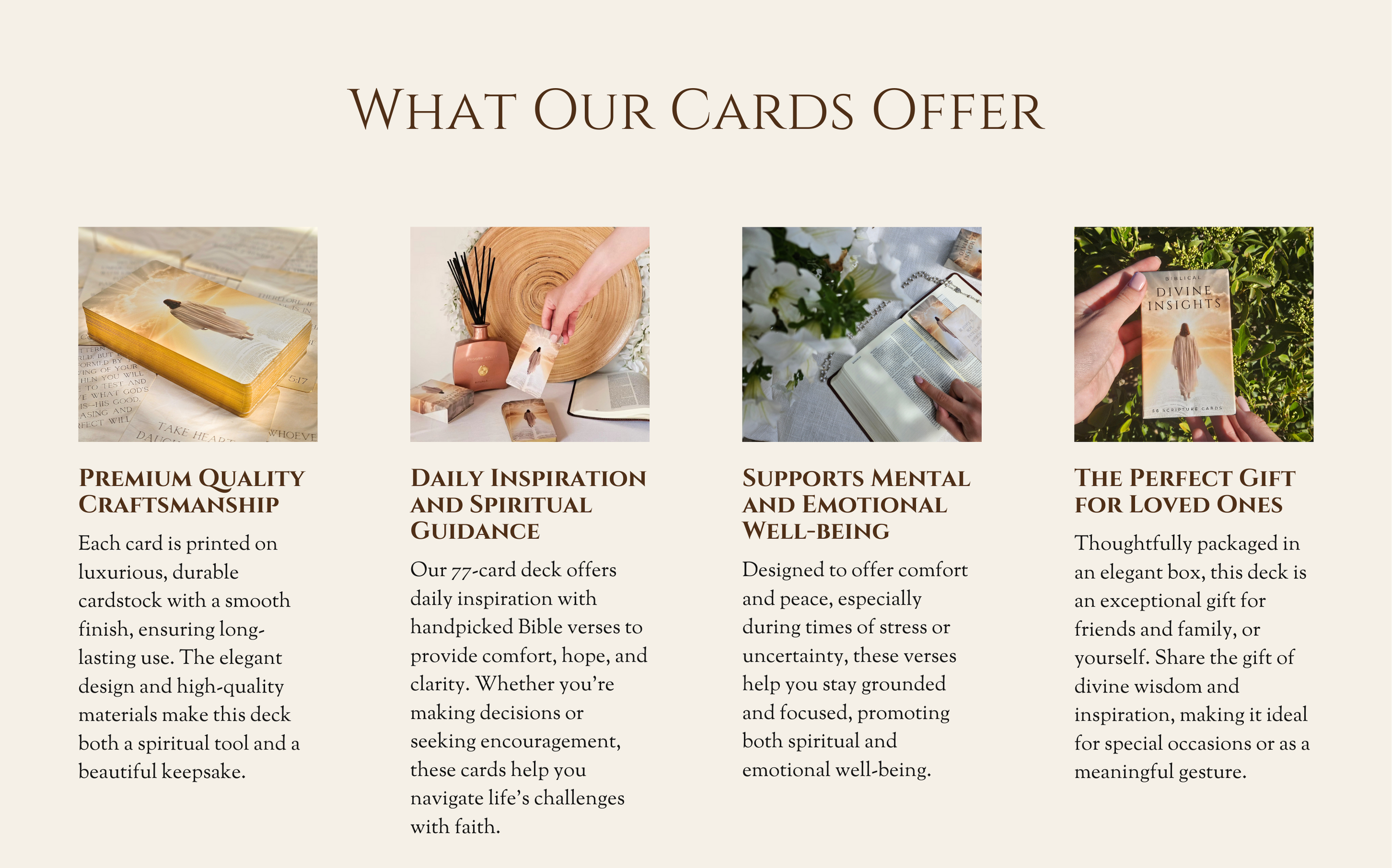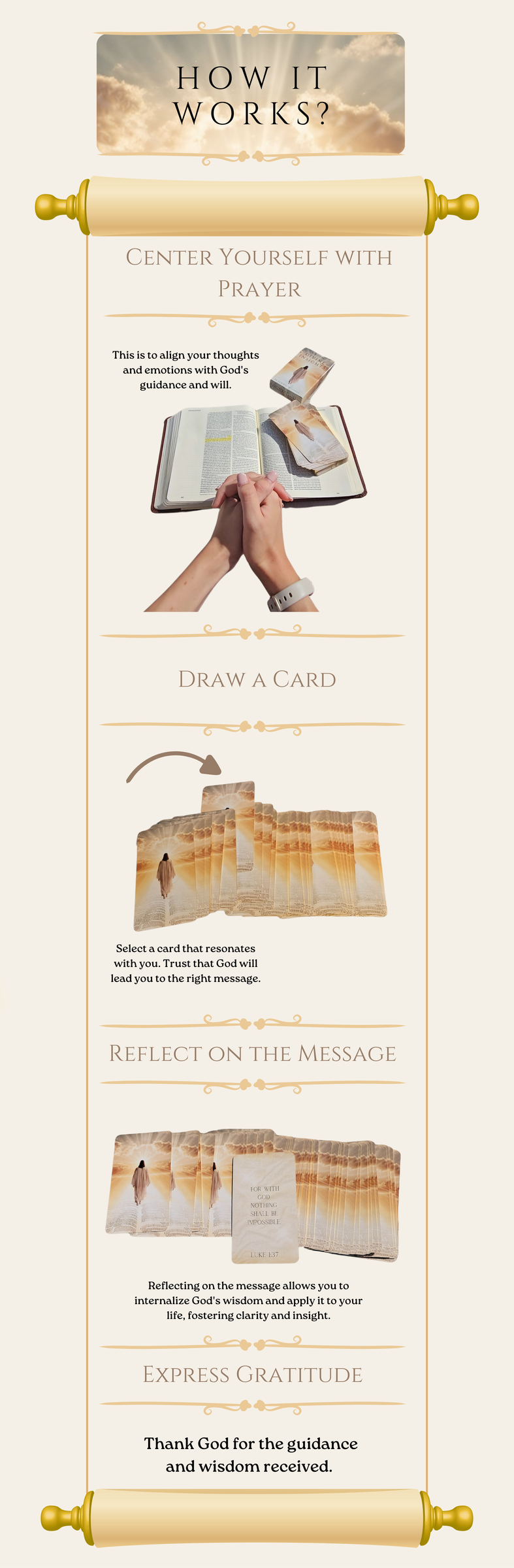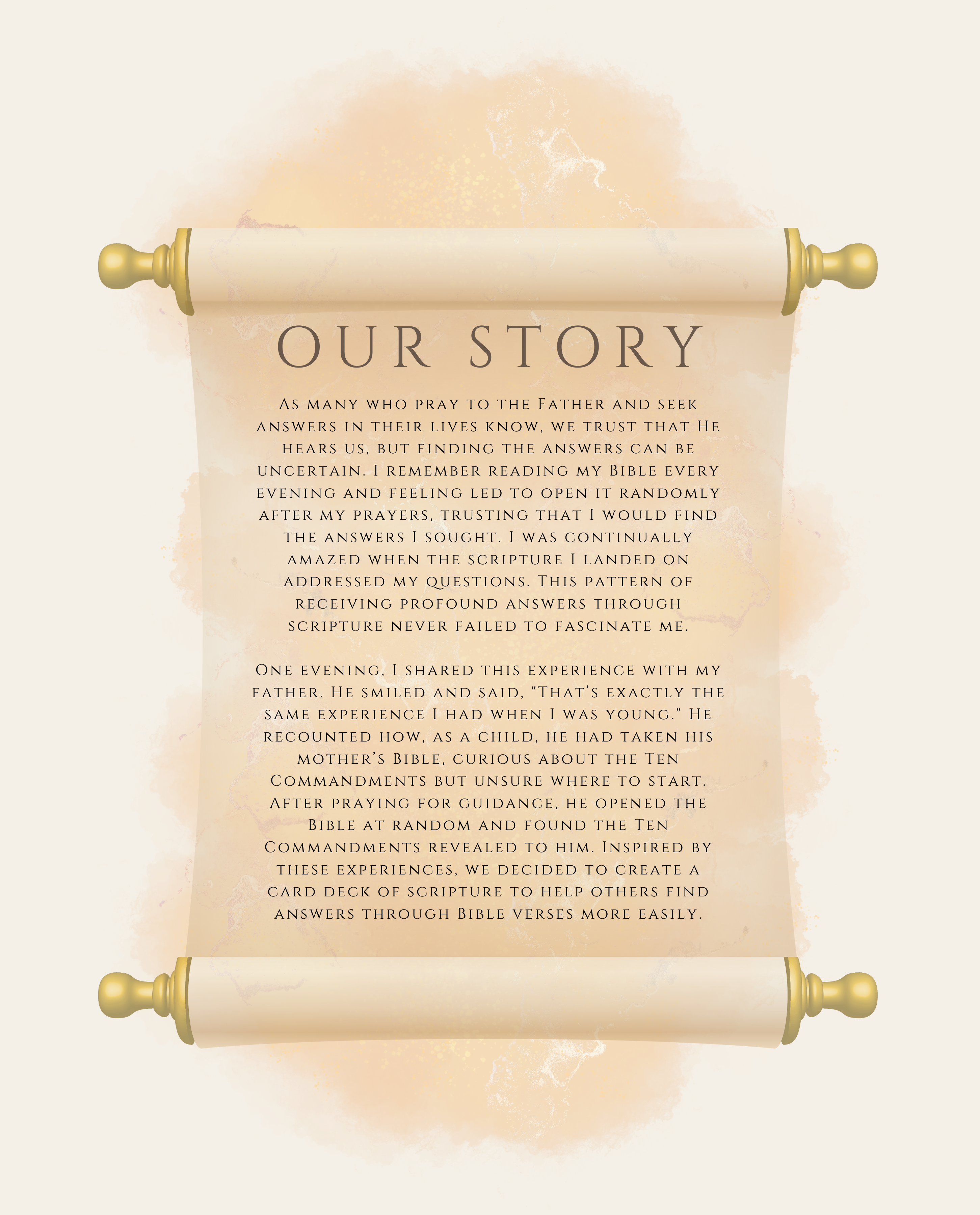 When you pray to the Father about why certain things happen in your life, we believe that through scripture, you can receive answers. Our 77-card deck has been carefully selected to offer guidance, hope, and inspiration from the Bible.